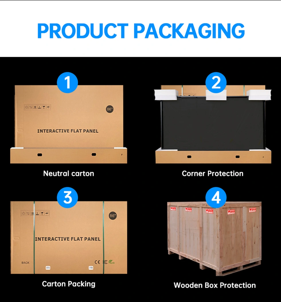 Det interaktive display er forsvarligt pakket i en neutral karton med forstærket trækassebeskyttelse for sikker transport.