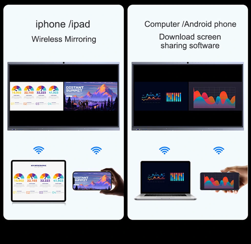 Denne kabelfri løsning tilbyder bred enhedskompatibilitet og skarp, synkroniseret projektion. Det muliggør skærmdeling med flere brugere med interaktiv omvendt kontrol for problemfri deling af videoer, musik og dokumenter.